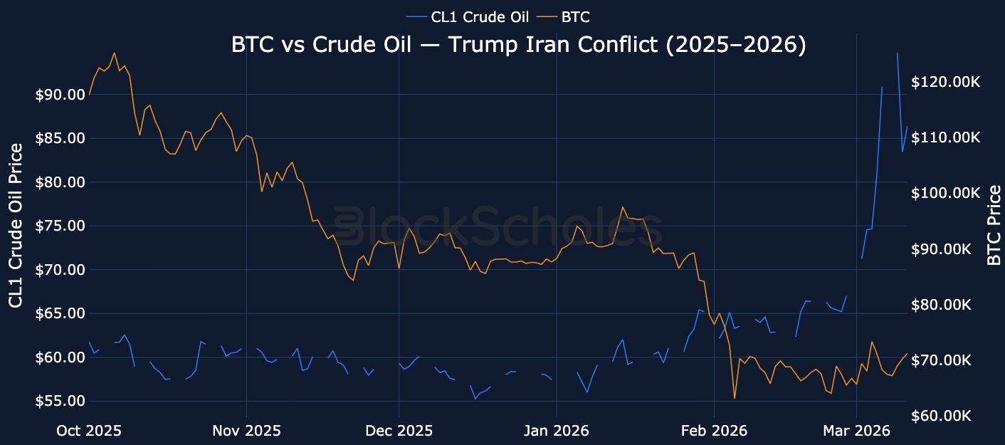 Separately, with the Strait of Hormuz effectively at a standstill and subsequent volatility in markets, crude oil has become one of the most talked about assets over the past two weeks. Prices have soared from $67 to nearly $120 before tumbling back lower for the time being. Despite moving upward alongside oil in Trump’s first-term interactions with Iran, BTC has shown a far less sensitive reaction to 2026's flare-up in energy supply chains.