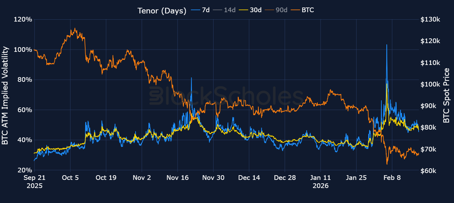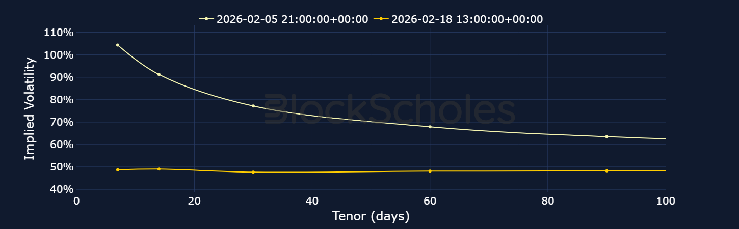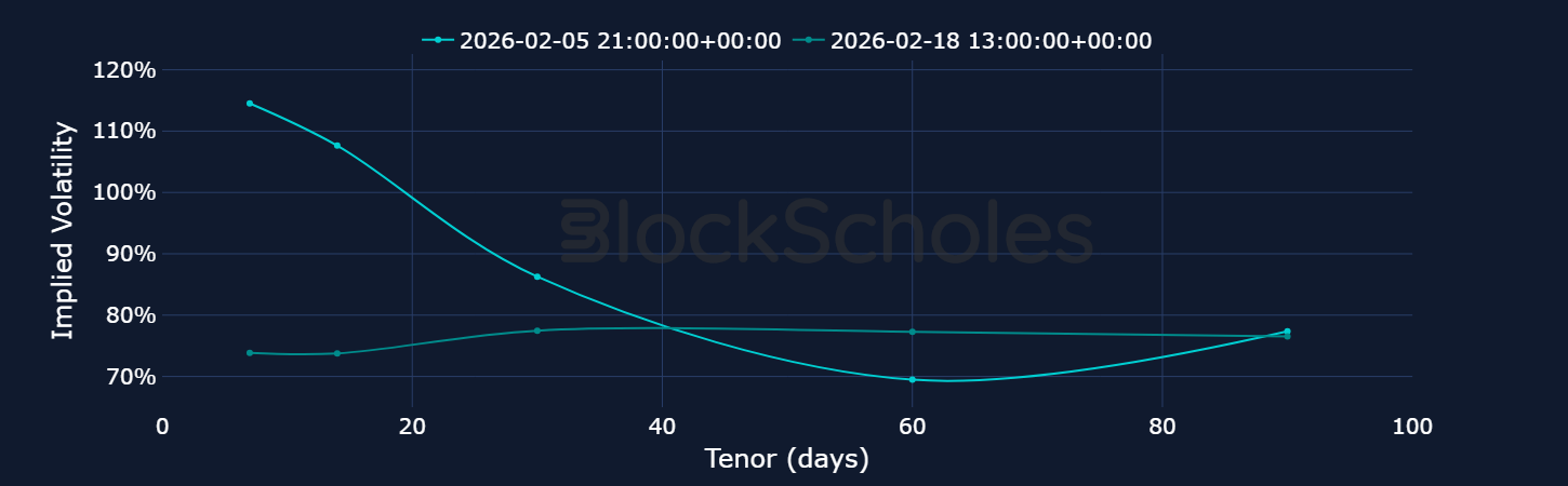 We see a similar decline in implied volatility beyond just BTC. The term structures of volatility for BTC, ETH and SOL are all currently compressed and flat, with traders pricing in minimal premiums for longer-dated options compared to near-term expiries. That significantly contrasts the positioning of two weeks ago, when short-dated volatility spiked across all assets on Feb 5, 2026, as BTC fell below $60K.