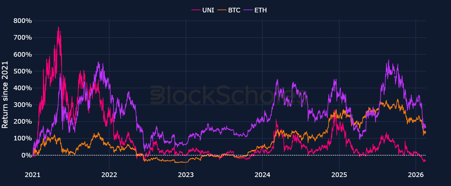 Zooming out, we can see that the UNI token has been on a steady decline ever since its May 2021 bull-market high of $44. In fact, while BTC and ETH have provided returns of 140% and 170% respectively since the start of 2021, UNI is down close to 30%. In last week’s edition we discussed the ‘Fat Protocol Thesis’, a thesis developed on the idea that base layer tokens would outperform application layer tokens.