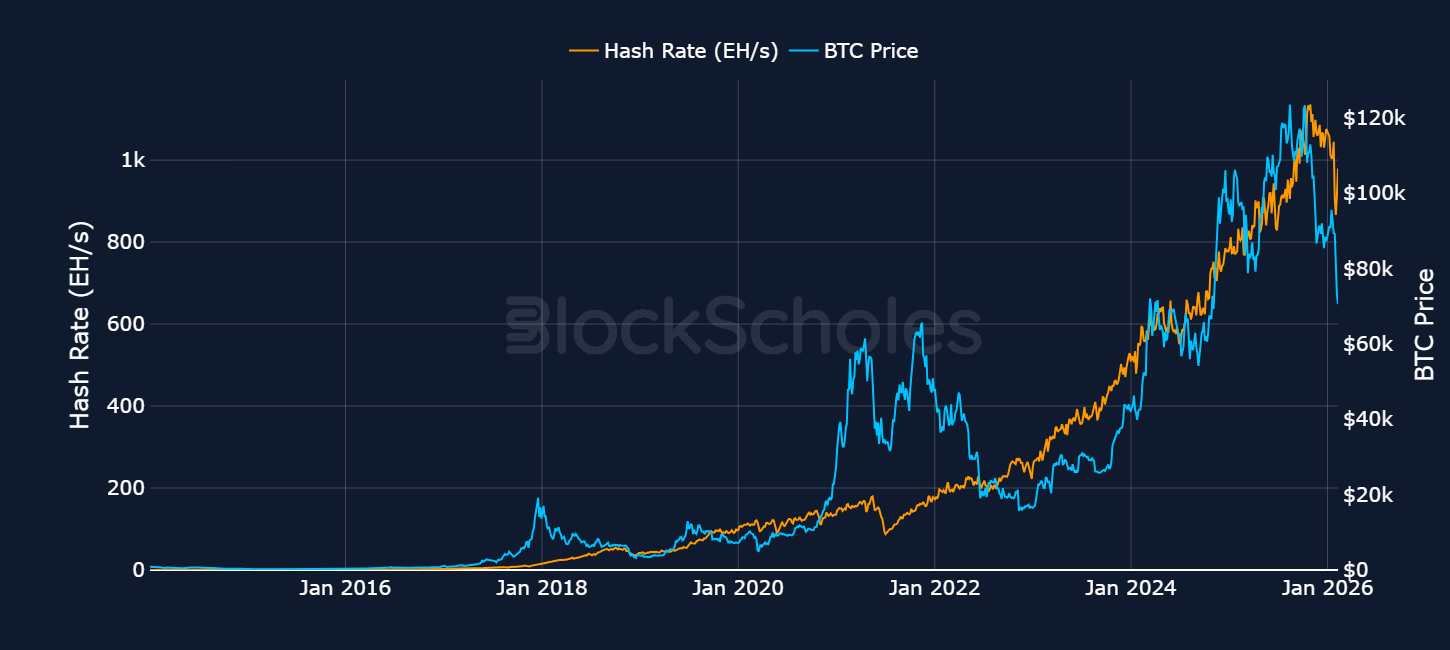 Late January 2026 saw a pronounced decline in Bitcoin’s hash rate, culminating in a flash hash crash on January 24. While the move occured close to the Feb 5 sell-off in BTC price, the drop in hash rate (typically a lagging indicator) occurred first, indicating that the disruption was not purely a function of mining economics.