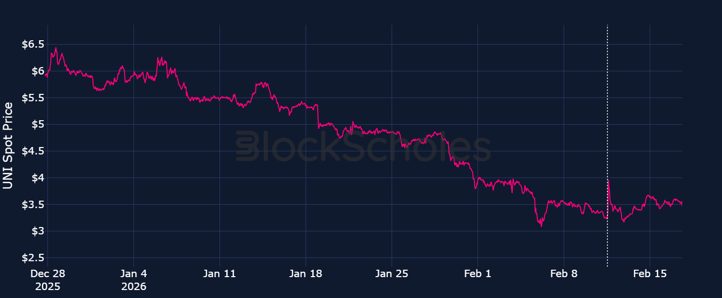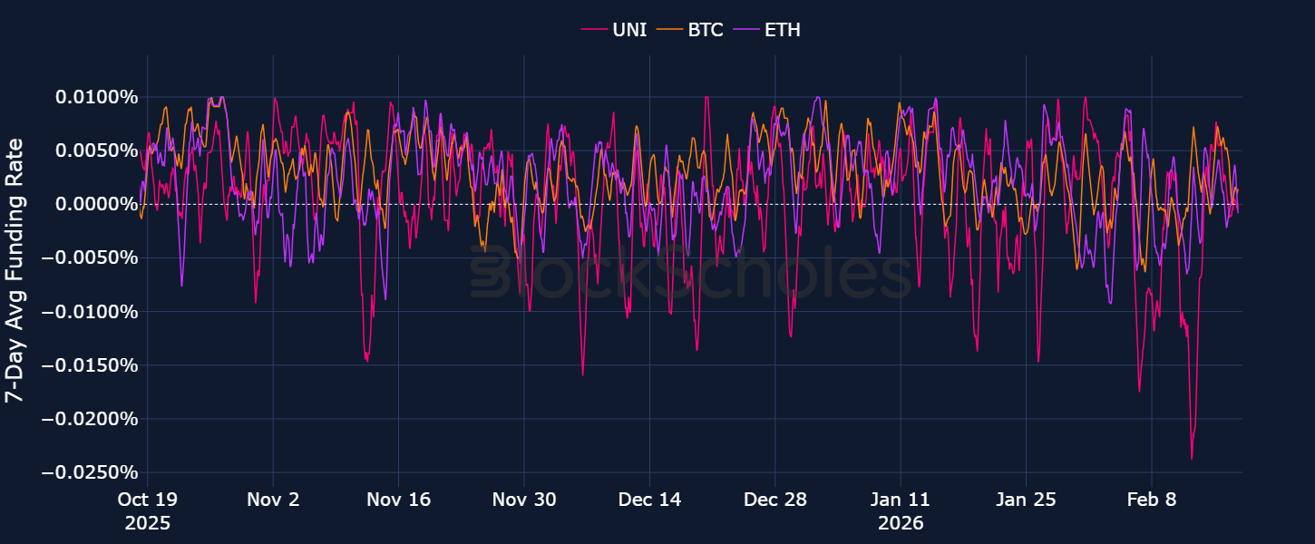 The initial market impact was clear — a more than 20% jump in UNI’s spot price from $3.2 to $4, allowing it to buck the wider bearish trend across the rest of the crypto market. However, the strategic announcement was not enough to sustain momentum in UNI’s spot price and it now trades only slightly above pre-announcement levels. Perpetual swap funding rates did not meaningfully back the rally either — with eight-hourly rates actually turning negative during the short-lived spot rally.