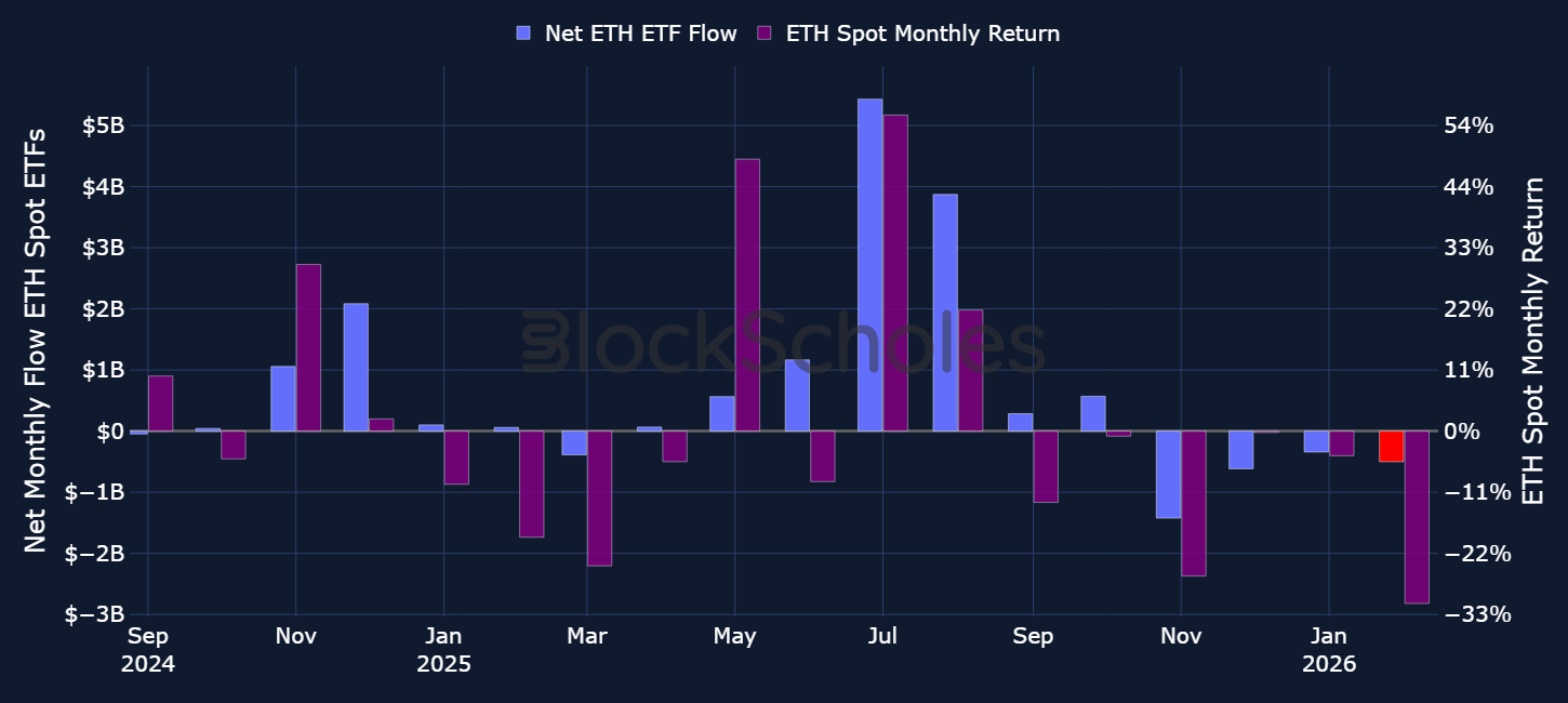 • Ethereum is showing a similar setup, with spot ETH ETFs also on pace for a fourth month of outflows, the longest stretch since their launch in July 2024.