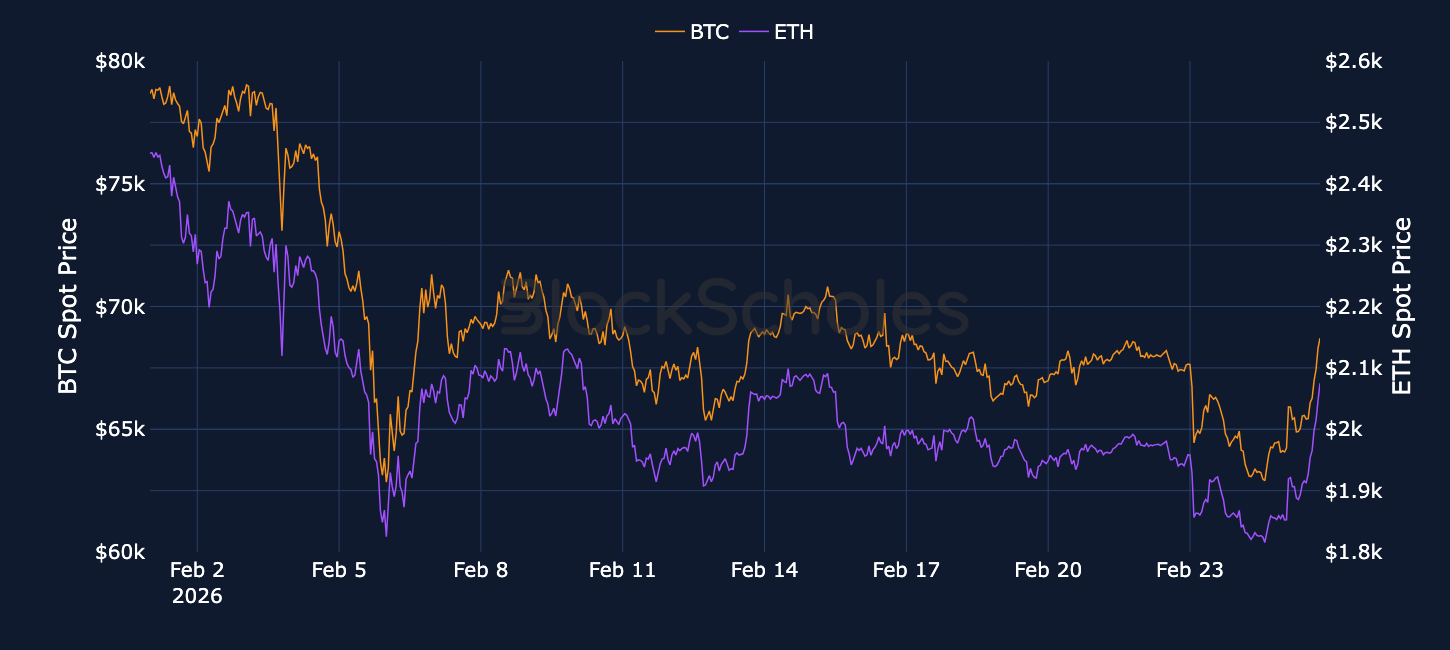 While BTC previously traded in a tight range, the low level of realized volatility broke this week when the price briefly fell to $62K. The move coincided with a weakening in risk appetite across broader markets, and options pricing responded quickly with a strong increase in demand for downside protection. However, a sharp correction back to the $68K levels at the time of writing, after a brief stint at the $70k handle, lost in the sell-off has not seen the same response in volatility markets.