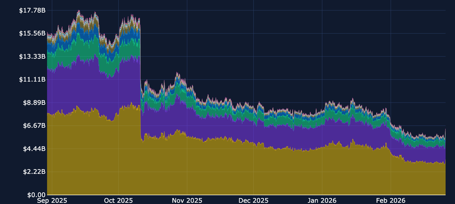 While the Oct 10th liquidation event saw the notional dollar amount of open interest in perpetual futures contracts more than halved, the most recent recovery in spot indicates that perpetual swap markets are backing the rally. After steadily declining for most of the remainder of Q4 2025 and since the new year, open interest levels in perpetual swaps of major tokens has reached its highest level since late January in the last 24 hours. Net open interest over 9 key token pairs now totals back above $6B.
