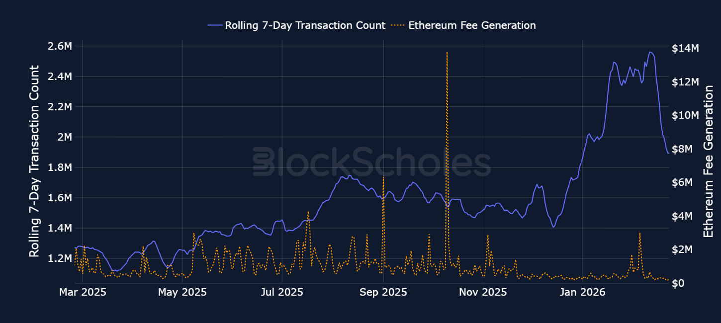 Ethereum's base fee charge is algorithmically adjusted based on network congestion. The decoupling between transaction count and fees generated by the Ethereum network results from increases in the gas limit per block. Gas in Ethereum is the unit of measurement for the computational work required to execute transactions and smart contract operations on the network. Gas limits per block increased from ~30M per block to ~36M in February 2025, then to 45 million on July 22, 2025, and finally to 60M in late November 2025, after a majority of Ethereum validators, more than 50% of staked validators proposing blocks, signalled support for a higher block gas limit.