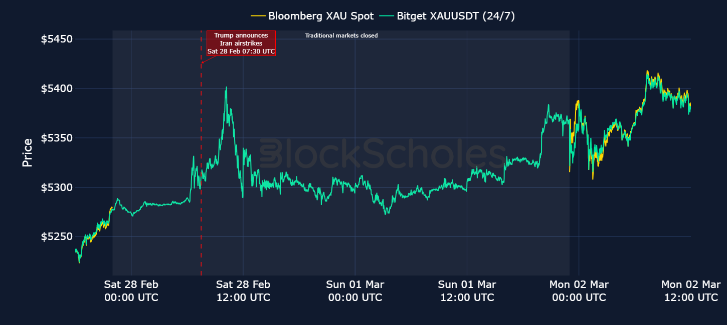 In TradFi markets, Bloomberg recorded gold’s spot price closing at $5,279 on Friday Feb 27, 2026. Following Trump’s announcement, traders rushed to Bitget’s XAUUSDT perp, pushing its price up to a peak of $5,402 (+2.3% from Friday's TradFi close). Then on Monday Mar 2, 2026, spot gold price on traditional markets opened with a gap up from Friday, reflecting the already weekend-discovered move higher on Bitget. Bloomberg gold price opened at $5,315; while the XAU USDT perp traded at $5,329 (a $13.29 spread) at the TradFi market open.