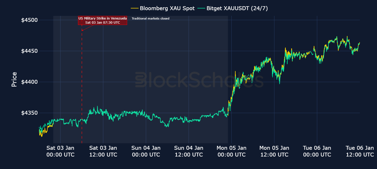 Unlike the operation in the Middle East, however, during the weekend of the Venezuelan attacks, onchain gold prices barely registered any moves. In fact, the real move in onchain prices occurred after traditional markets had opened on the following Monday (Jan 5) and onchain prices followed traditional spot gold prices higher up towards $4,450 per ounce.