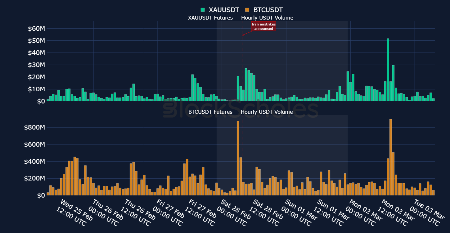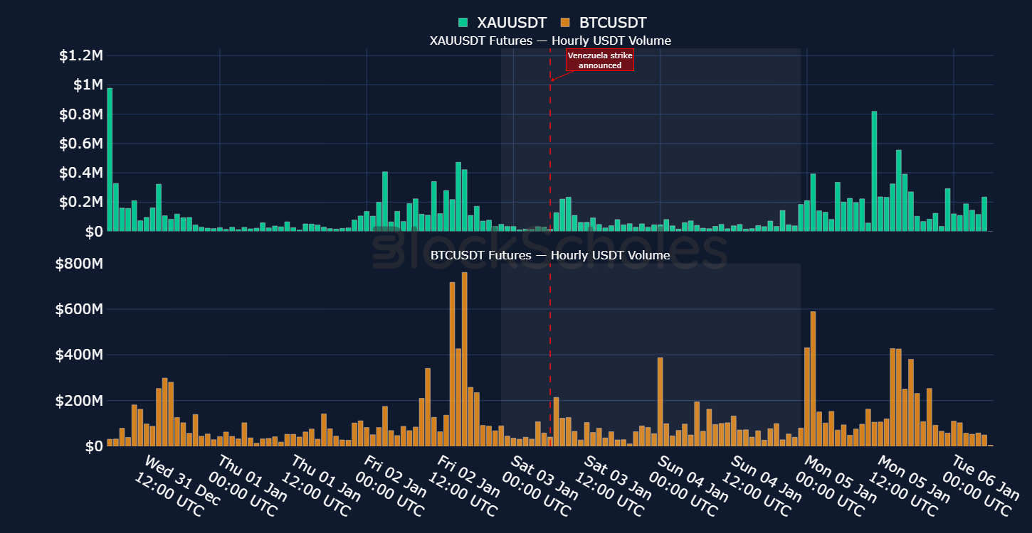 Together, this reveals two things: the first is that during the start of the Iran intervention, traders showed a much stronger willingness to hedge and enter positions within gold perpetual contracts, relative to the earlier Venezuelan intervention and that in turn may partly explain why the weekend gold moves onchain echoed the traditional market ahead of time during the Iran strikes, but only moved higher after global markets opened during Maduro’s capture. Secondly, liquidity and volumes in both instruments tend to be much higher during traditional market open hours than outside them. In both military interventions, gold and BTC perp volumes were comparatively much higher during hours that coincide with the period when global markets are open than during the weekends.