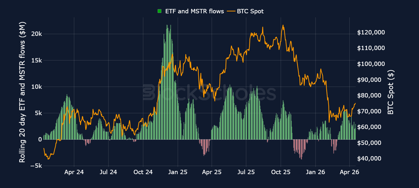 The sell-off at the beginning of the year saw the rolling 20-day sum of that demand drop into negative territory as these groups were net sellers of BTC, far below the highs of 2025. However, since March 2026 inflows have dominated outflows once again.