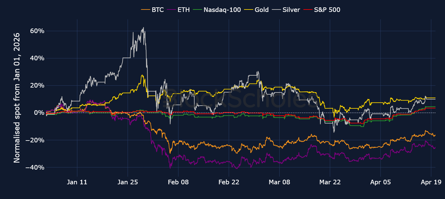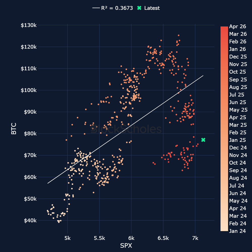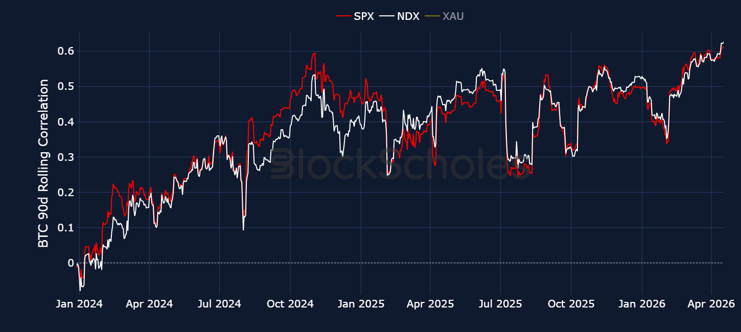 Despite this spot divergence, BTC’s correlation with the S&P 500 and Nasdaq 100 is at its highest level since November 2025. Crypto has always been a more volatile asset class, often acting like a leveraged trade on market sentiment, outperforming when markets rally and falling more sharply during downturns. So far this year, however, the dynamic looks different. While BTC’s correlation with equities remains dominant, it has been selling off far more aggressively in market downturns while rebounding far more softly in broader market recoveries.