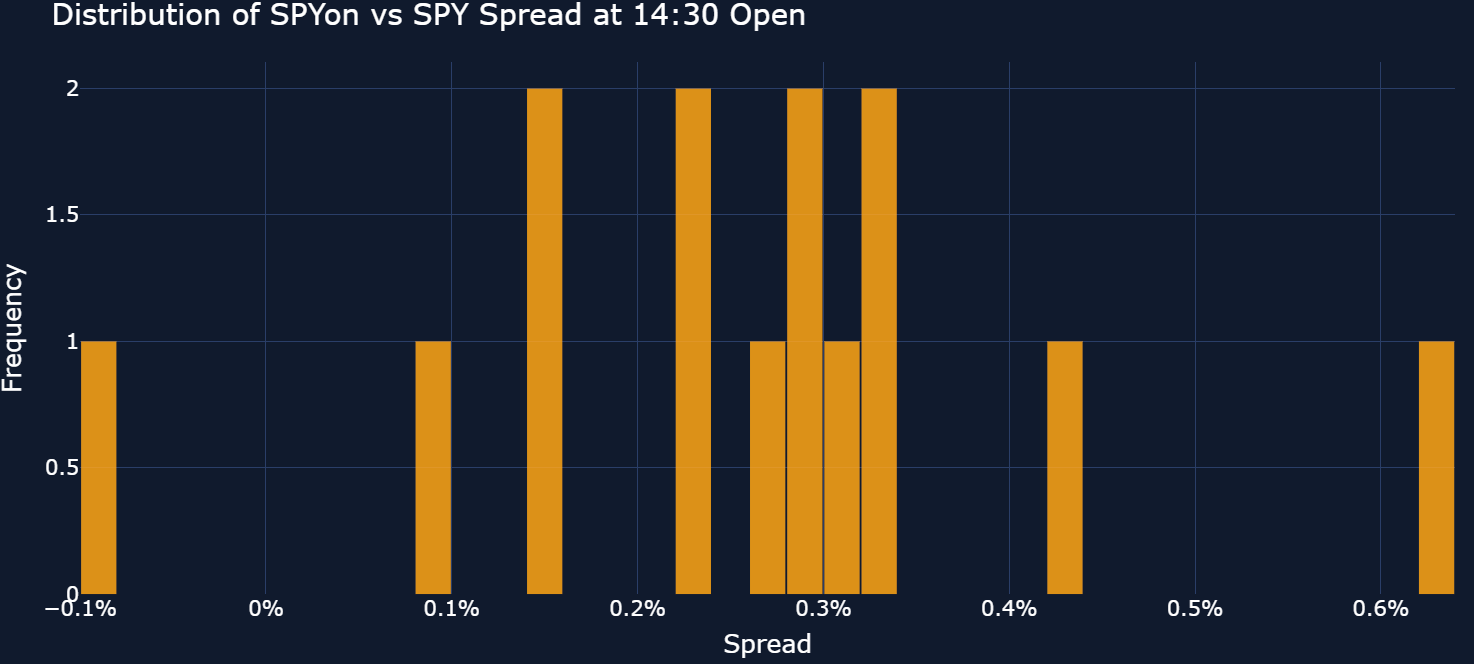 Figure 7. Distribution of the spread between SPYon and SPY during the open hour of SPY. Source: Block Scholes