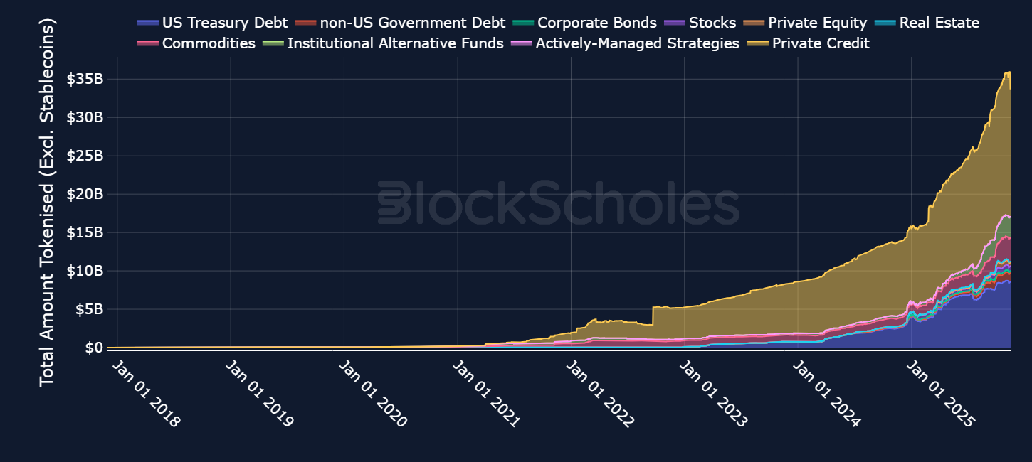 Tokenized RWAs are in a growth phase across multiple segments, from established stablecoins to newer institutional products and tokenized equities. The broader RWA market has expanded alongside rising stablecoin demand since the 2020–21 period, with non-stablecoin RWAs, such as private-market instruments and U.S. Treasuries, increasingly focused on institutional offerings. Tokenized stocks are a more recent development, with meaningful growth only beginning in Q3 2025 and largely driven by products such as xStocks and Ondo.