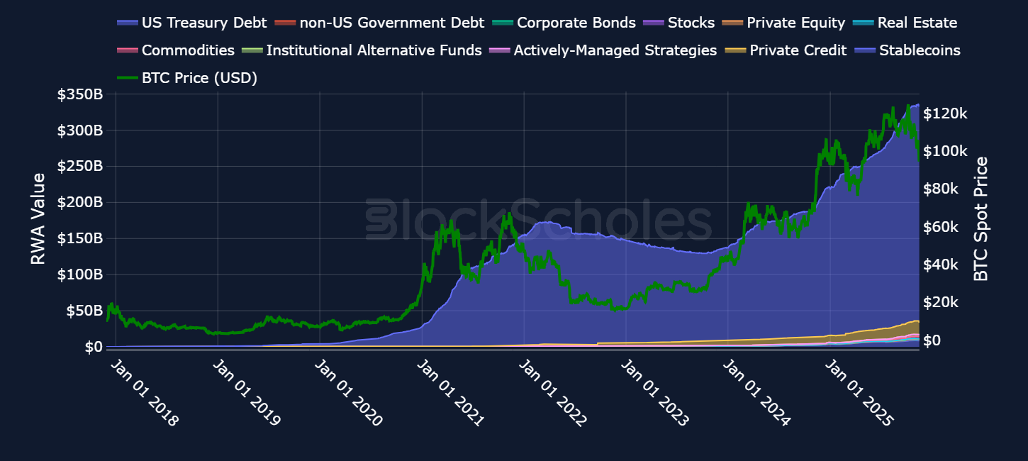 Figure 1. RWAs Values compared to Spot BTc in USD (green). Source: Block Scholes