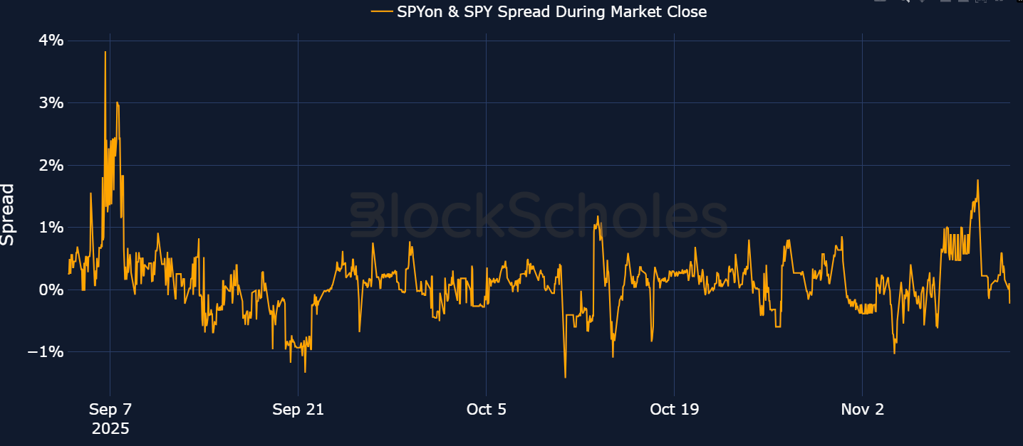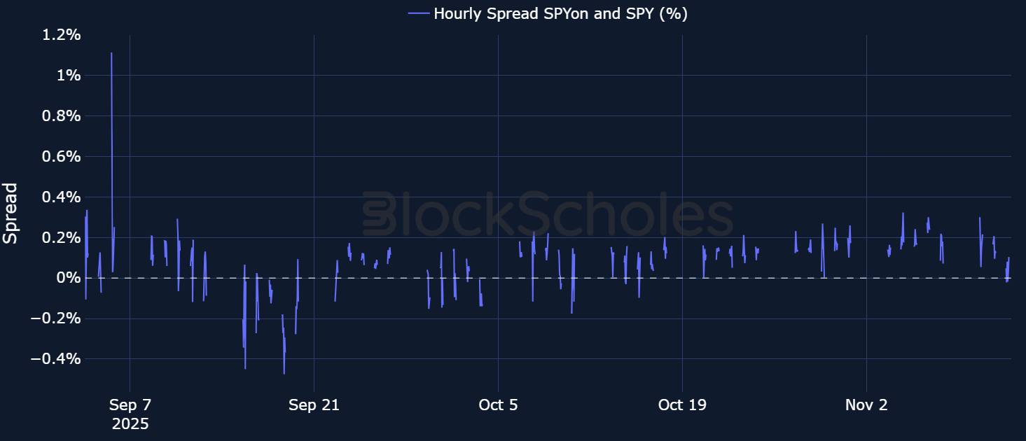 While the two look to track each other quite closely, given the fact that SPY trades only in US market hours — 09:30-16:00 ET (or 14:30-21:00 UTC), Monday-Friday, compared to the 24-7 nature of SPYon, a clearer visualization of how well the two track one another is by looking at their intraday spread. We measure the spread as how far the tokenized asset (SPYon) trades above or below the SPY ETF, expressed as a percentage of the SPY ETF price. In other words, when the spread is negative, SPYon is cheaper than  the off-chain SPY price and when the spread is positive, say 0.5%, it means SPYon is trading 0.5% above the real SPY ETF price.
