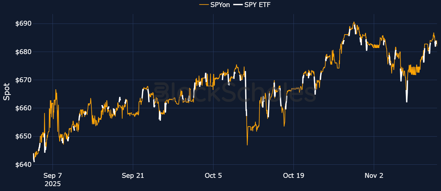 As seen below, between Oct 21, 2025 and Nov 18, 2025, the price of SPYon tends to be slightly higher than the price of SPY during its open, but that spread for the most part is clustered between 0.2% and 0.3%. Only once over the one month period did SPYon trade at a discounted price when the SPY market opened.